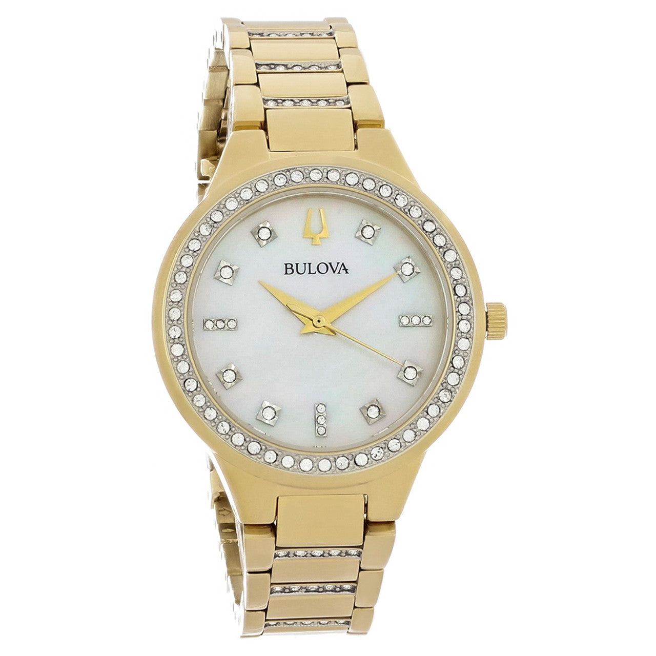 | Mother-of-pearl dial with gold-tone hands for soft, elegant contrast | |